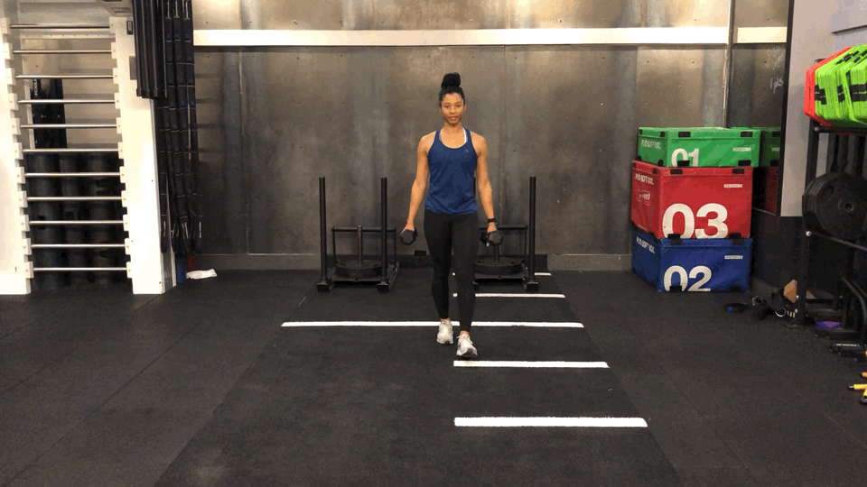 - З витягнутими руками тримайте гантелі на відстані близько 10 см від ніг. Це активує ваші м'язи живота. Почніть йти вперед, підтримуючи нейтральний хребет і зберігаючи плечі відкритими.