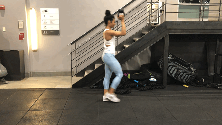 Візьміть одну гантель або медичний м'яч, перш ніж почати. Якщо ви новачок, використовуйте не більше 5 кг. Якщо ви більш просунуті, використовуйте мінімум 10 кг; просто переконайтеся, що ваша форма не розвалюється. Виконайте один набір кожної вправи без перерв. Після того, як ви завершили один раунд, візьміть одну хвилину відпочинку. Повторіть в загальній складності чотири сети: